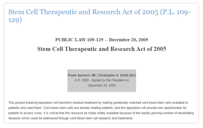 2005年,美国国会批准了干细胞治疗和研究法案,授权通过合格的脐带血库收集和维护15万单位的高质量脐带血,以有效准备和应对生物、化学或放射性攻击以及其他可能损害骨髓的公共卫生紧急情况。
