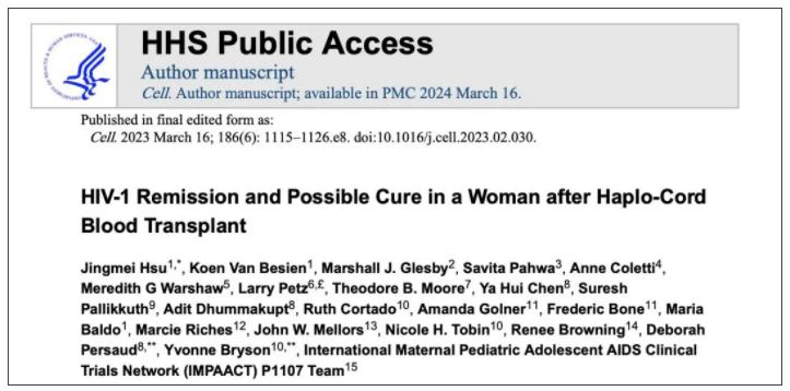 2023年,Cell发表的一篇突破性研究在全球引起了巨大轰动,再次让人们认识到脐带血的重要价值。威尔康奈尔医学院团队报告,一例女性HIV-1患者接受了CCR5Δ32/Δ32单倍体脐带血移植(脐带血细胞与成人单倍体相合干细胞结合)来治疗急性髓系白血病。患者停用抗逆转录病毒治疗(ART)后仍经历了18个月的HIV-1无病毒血症,未检测到HIV-1特异性免疫反应,并且无移植物抗宿主病,所有这些都支持HIV-1可能治愈的状态。