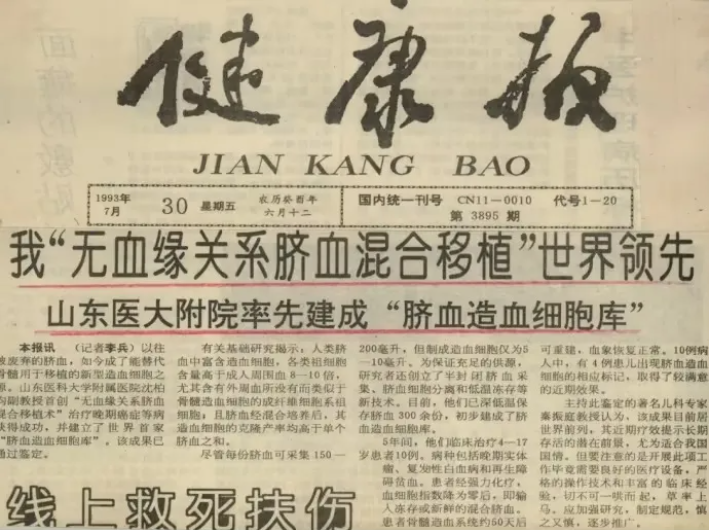 我国脐带血造血干细胞移植的研究一直紧跟世界步伐。早在上个世纪80年代,鉴于骨髓移植术受HLA配型限制,山东大学齐鲁医院血液肿瘤专家沈柏均教授就设想用脐带血代替骨髓,进行造血细胞移植,解决供源问题。终于在1991年,沈柏均教授带领科研团队完成世界上第一例混合脐带血移植,救治了一名4岁的脂肪肉瘤患者,由此拉开了脐带血在中国临床研究的序幕。